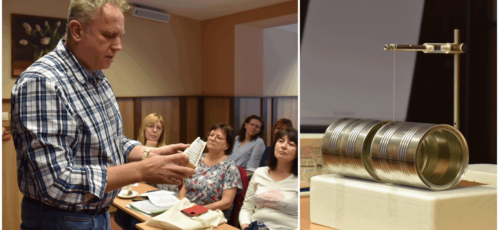 Aj napriek vyšším počtom žiakov v triedach sa jeho kolegom z iných škôl úspešne darí praktické aktivity do fyziky zaraďovať. Patrí k nim napríklad Monika Mišunová z Gymnázia v Trstenej, ktorá sa svojim žiakom rozhodla tému akustiky predstaviť pomocou hudobných nástrojov. Žiaci si na hodinu priniesli vlastné nástroje, medzi nimi aj heligonku, ktorú rozobrali a na jej častiach si ukázali princípy ladenia, tlmenia či tvorby prievanu. Hodinu si spríjemnili tým, že si nakoniec spoločne zahrali.